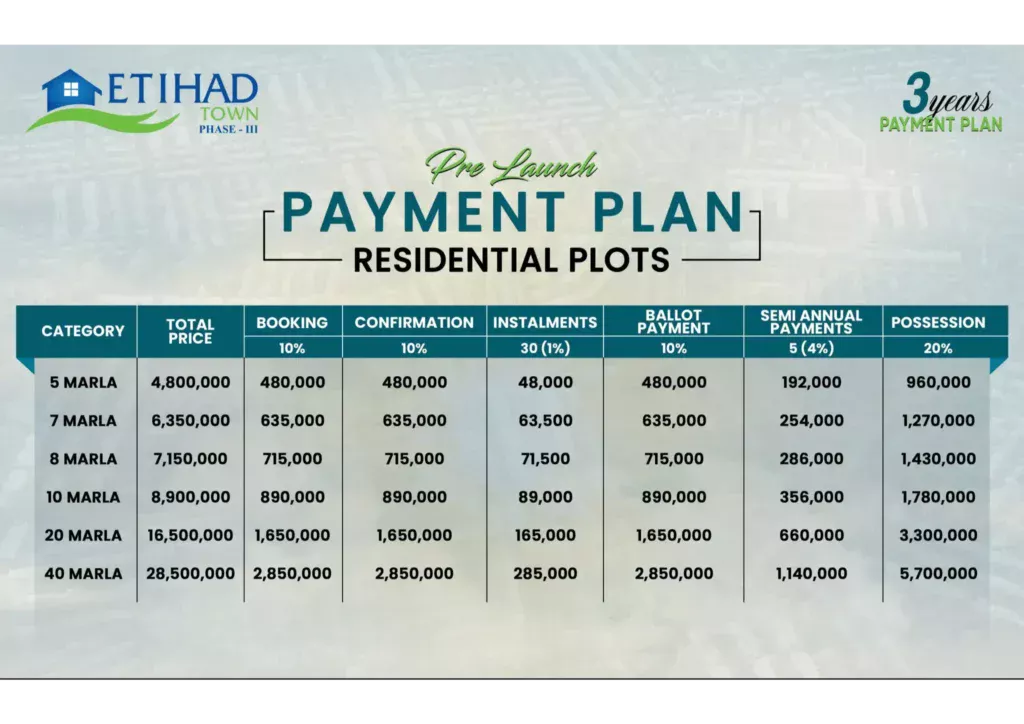 Etihad Town offers residential plots and commercial plots with easy installments designed to make ownership achievable. Each payment plan typically includes: