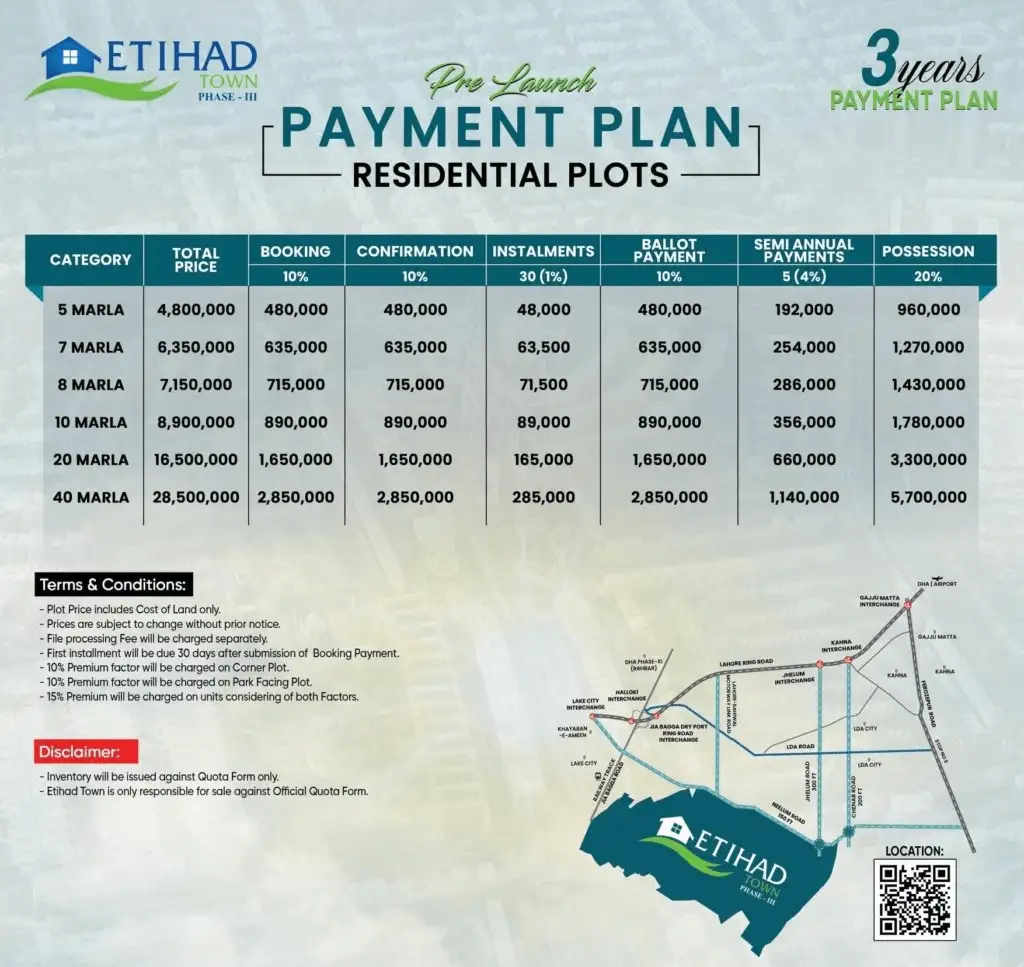 Get the latest Etihad Town Lahore Phase 3 payment plan with flexible 3-year installment plan and monthly installments. Confirm which plots are currently open for booking.