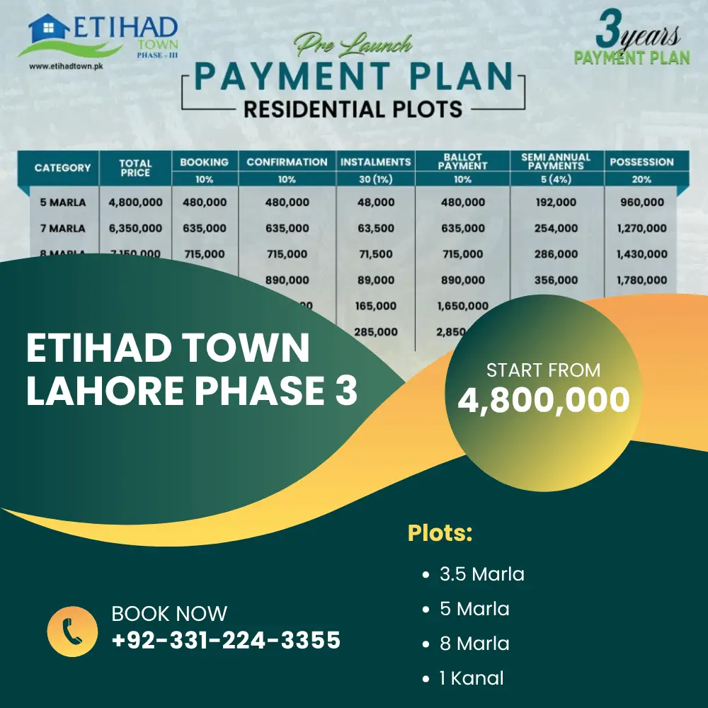 With limited plots available at attractive pre-launch plot prices, a flexible 3-year installment plan, and a strategic location near Lahore’s main growth corridors, now is the perfect time to secure your property in Etihad Town Lahore Phase 3.